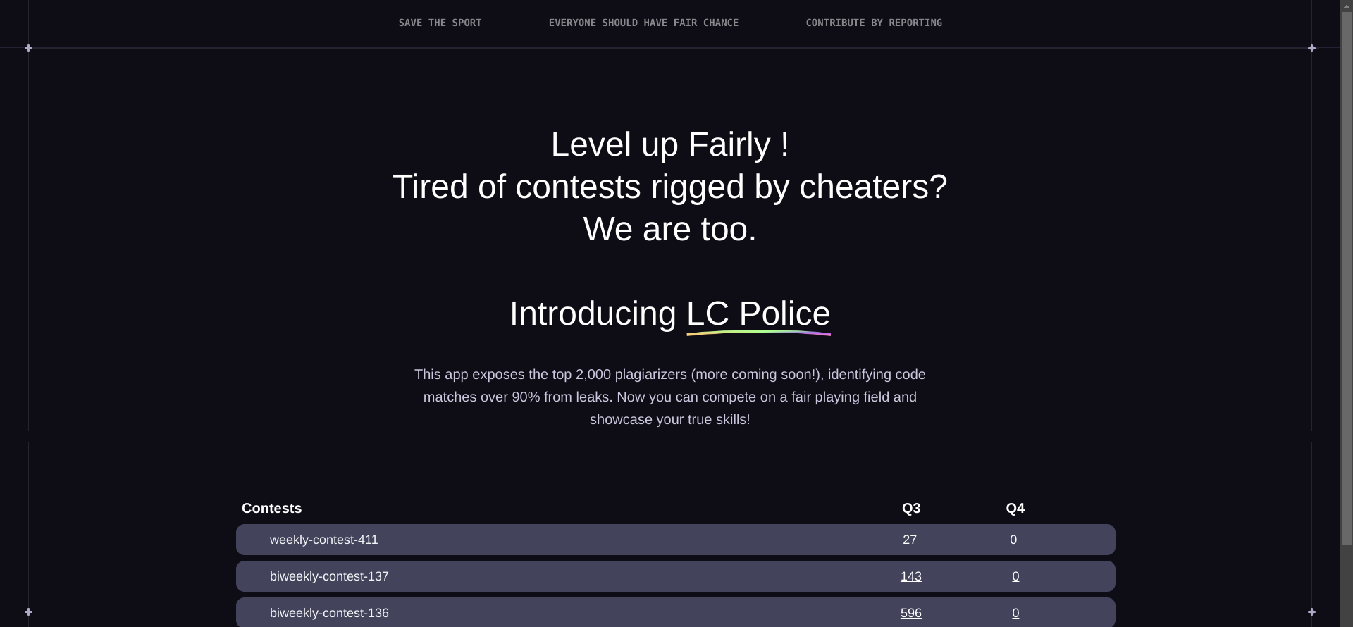 constproject={name:'LC Police',tools: ['ExpressJS', 'MongoDB', 'Python', 'Selenium', 'JS', 'React JS', 'Redux', 'Vercel', 'TailWind CSS', 'LLAMA],myRole:Full Stack Development,Description: Being tired of all the cheating groups degrading the actual experience of programming contests and online assesment this app aims to find cheater using MISTRA , LLAMA , Gemma with inference models using GROQ , It utilizes the power of prompt engineer and Abstract SYntax Tree methods to be a state of art model to predict plagarism in code submitted by users during the contest .,};